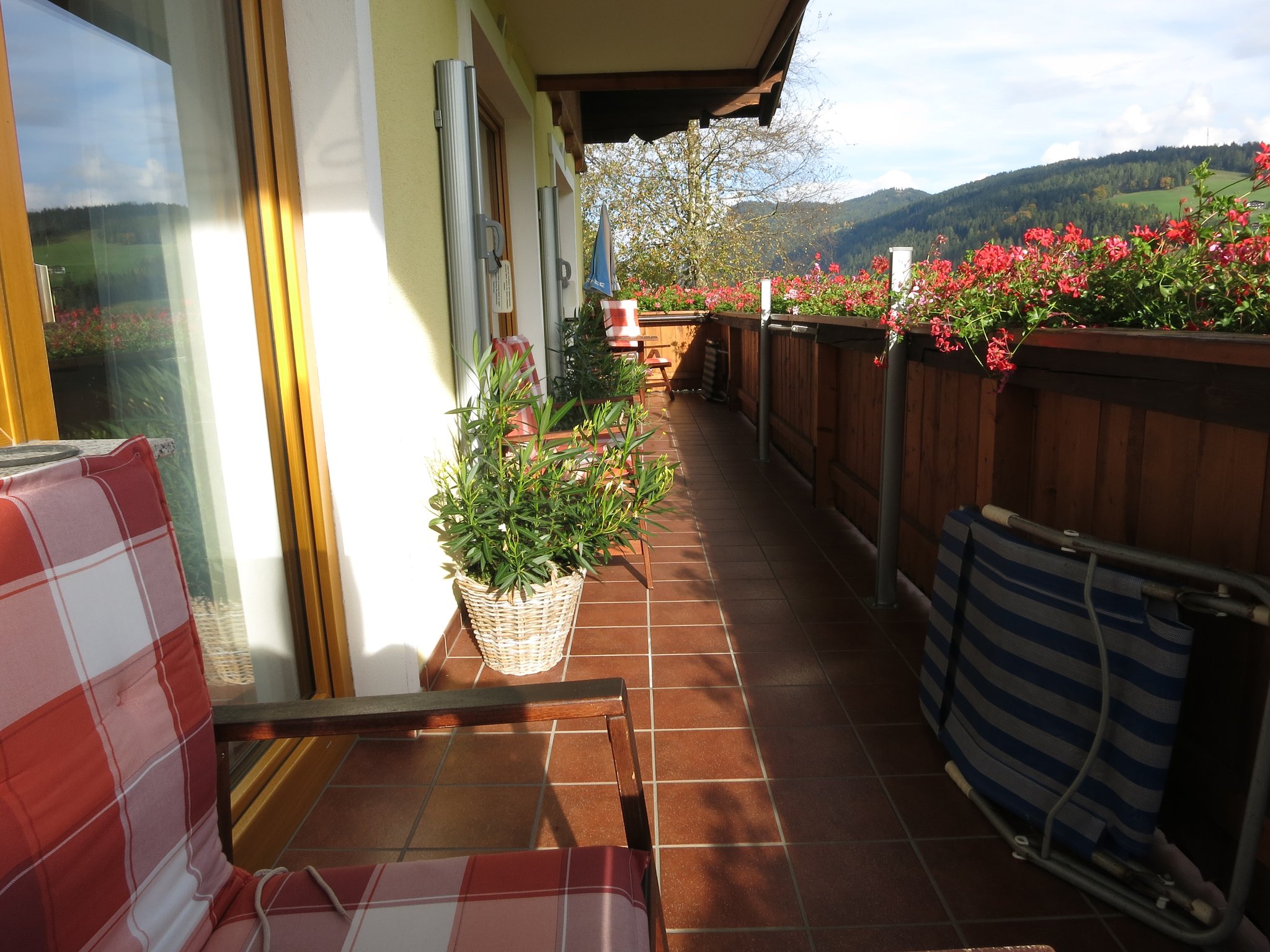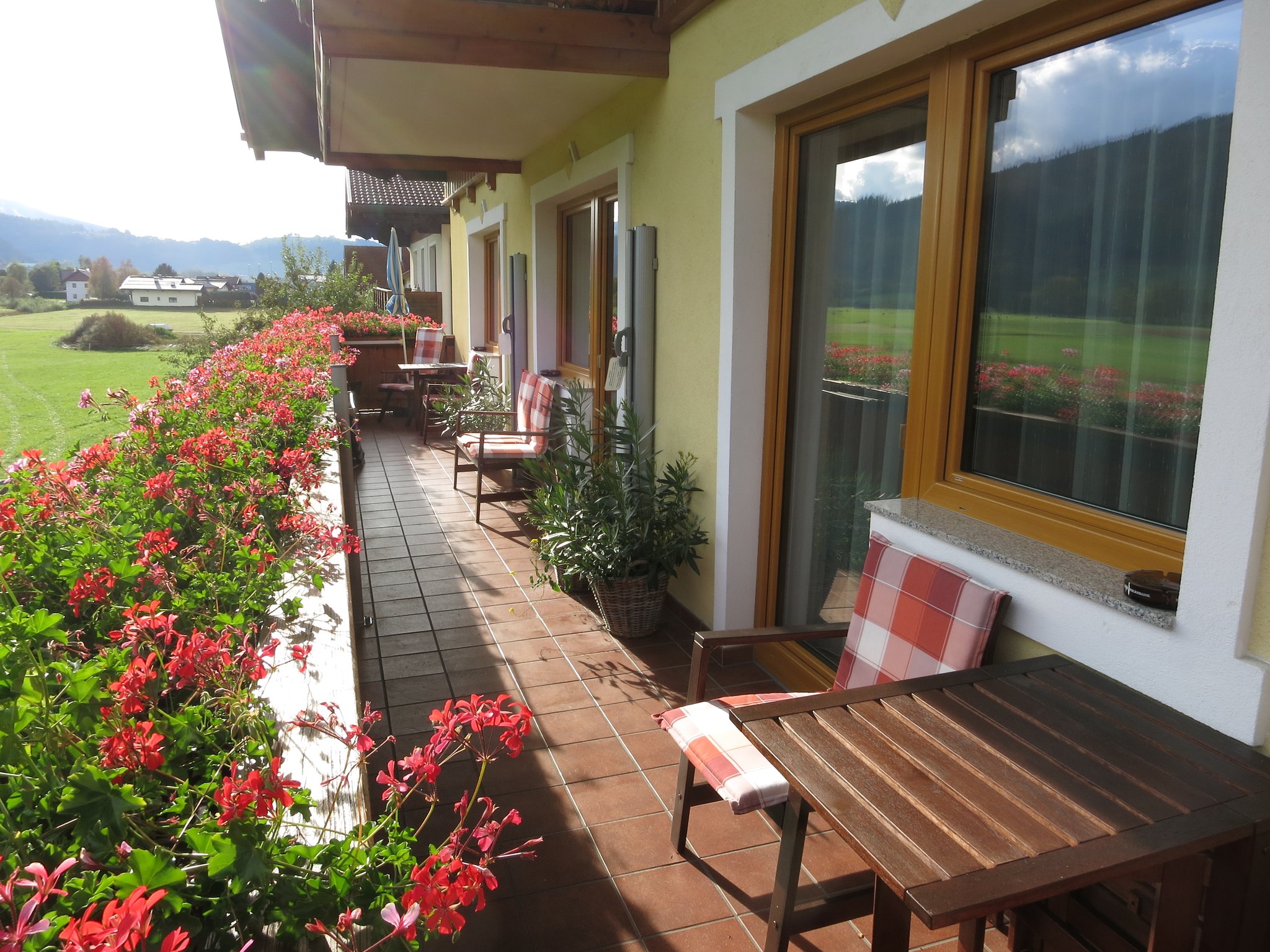 Die Balkone im Haus Wiesenrain sind nach Süden ausgerichtet und bieten freien Blick auf die Berge, Wiesen und den nahe gelegenen Golfplatz.